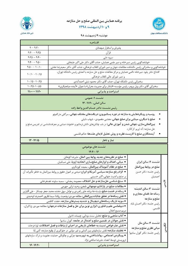 برگزاری سالانه همایش بین المللی مطالعات صلح و حل منازعه در دانشگاه تهران، ساحتی برای تبادل نظر و طرح ایده های نو در باب مطالعات صلح و و فنون و مهارت های حل منازعه است. این همایش در صدد فراهم سازیِ بستری است تا صاحب نظران و دغدغه مندانِ این حوزه با رویکردهای مختلف دینی، اخلاقی، روانشناختی، جامعه شناختی، هنر، رسانه، حقوق بشر، محیط زیست، و… دانسته ها و تجارب خود را به اشتراک بگذارند و به هم افزایی بپردازند. بنابراین، مقالات نوآورانه با چارچوب های نظری و روش شناسی گوناگون و با رویکرد کاربردی و حل مسأله، فرصت طرح در کنفرانس حاضر را خواهند داشت.