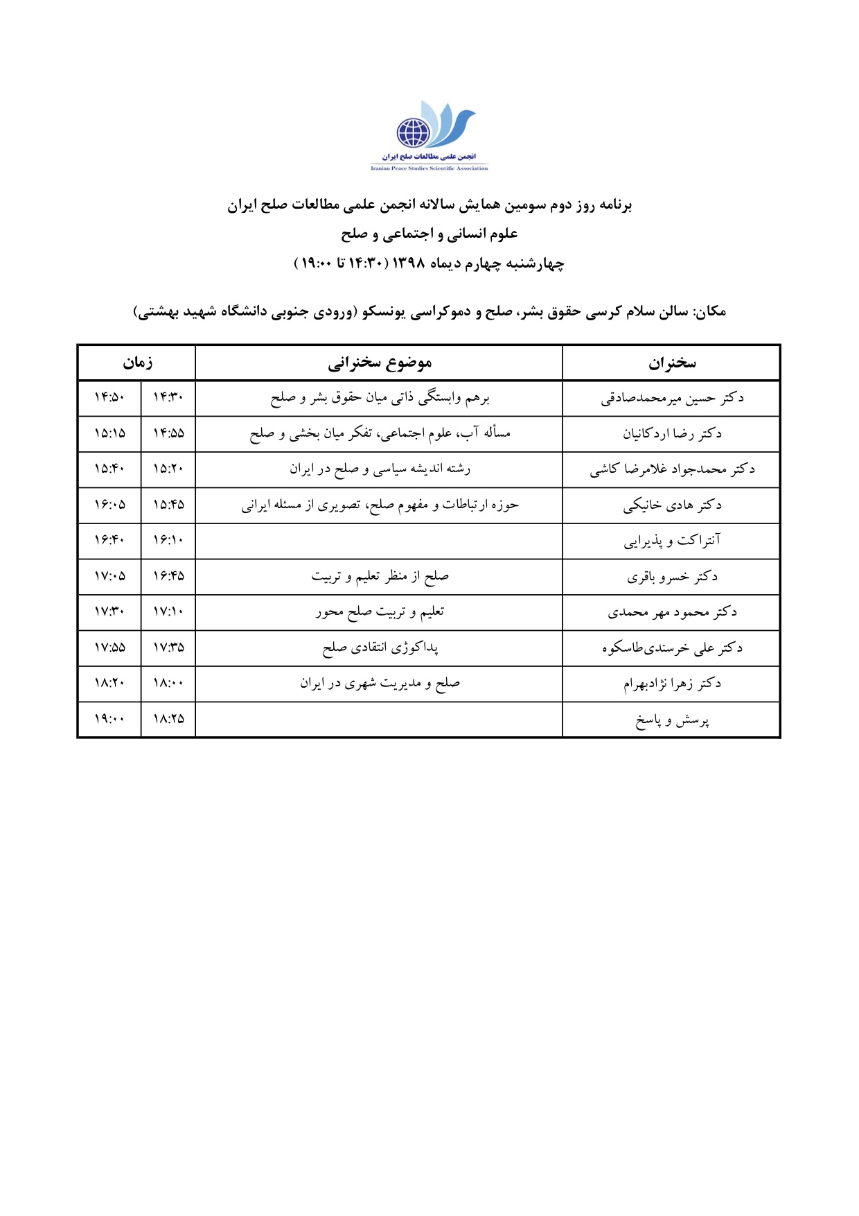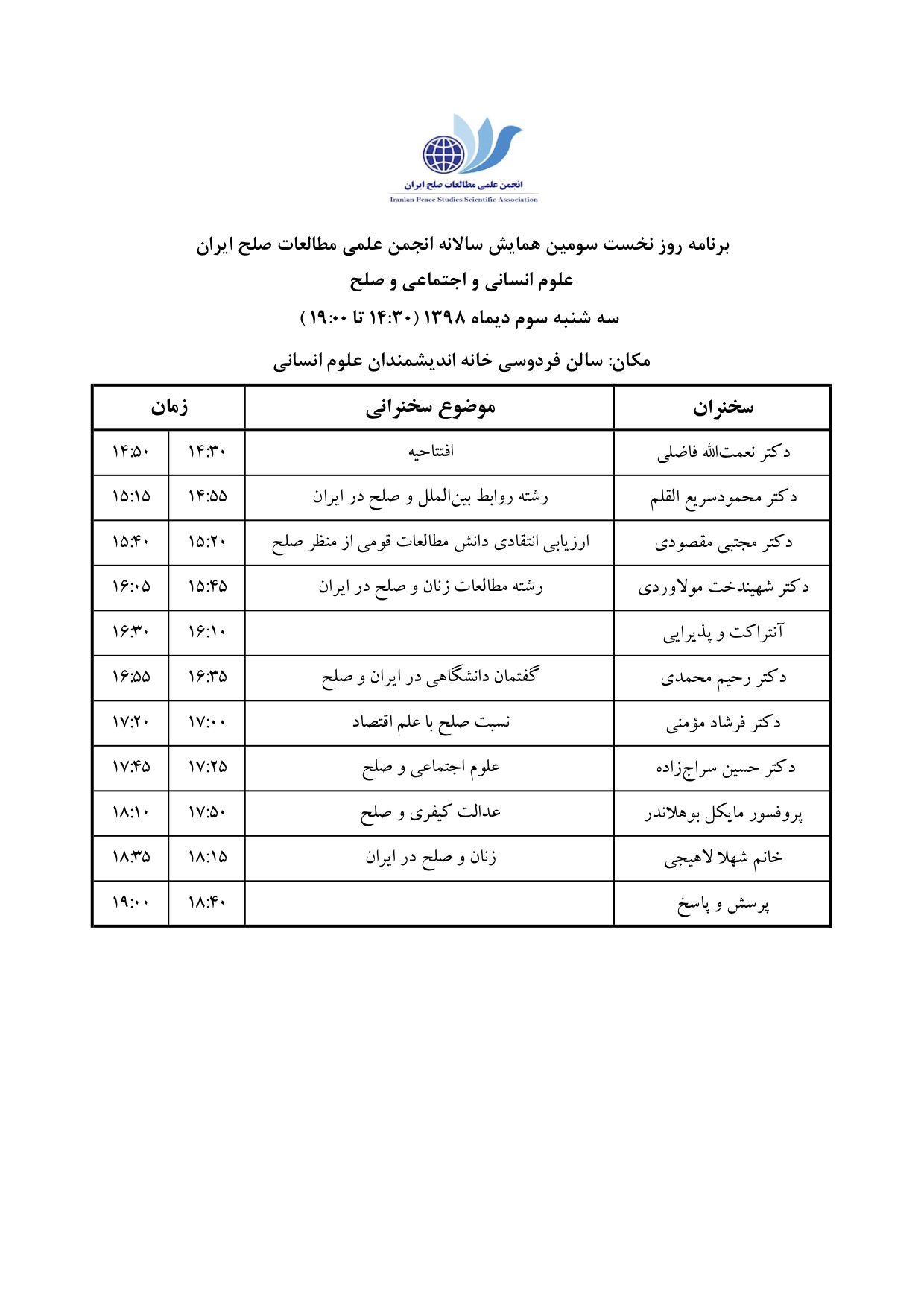 برنامه همایش علوم انسانی و اجتماعی و صلح، سوم تا پنجم دیماه