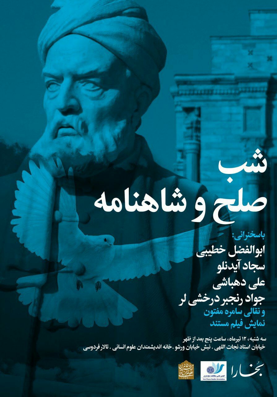 نخستین نشست، شب صلح و شاهنامه از سلسله شب های مجله بخارا بود که با سخنرانی ابوالفضل خطیبی، سجاد آیدنلو، جواد رنجبر درخشیلر و علی دهباشی در سالن فردوسی خانه اندیشمندان علوم انسانی در روز ۱۲ تیر سال ۹۷ برگزار شد.