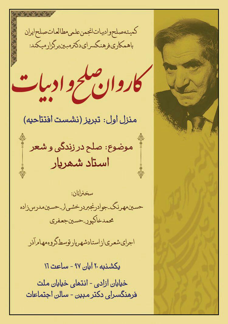 نشست سوم، صلح در زندگی و شعر استاد شهریار بود که در تبریز در روز ۲۰ آبان سال ۹۷ در فرهنگسرای دکتر مبین برگزار شد و نخستین برنامه از مجموعه کاروان صلح و ادبیات بود.
