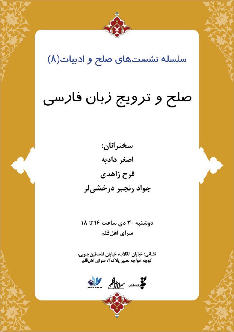 نشست هشتم، با موضوع صلح و ترویج زبان فارسی، با سخنرانی اصغر دادبه، فرح زاهدی و جواد رنجبر درخشیلر در روز دوشنبه ۳۰ دی سال ۹۸در سرای اهل قلم برگزار شد.