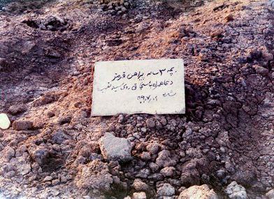 نکته ای را که تاکنون به ذهنم رسیده است، شاید بتوانم با دو عکس قدیمی نشان دهم: اولی عکسی است که اوائل سال ۱۳۹۰ هنگام بازدید از مرکز فرهنگی دفاع مقدس خرمشهر گرفته ام (تابلویی بود که به دیوار آویخته بود) و مربوط به روزهای نخست جنگ است؛ و دومی را هم هنگام جستجوهای اینترنتی دیدم و این هم مربوط به آبادان در روزهای نخست جنگ (۱۲ مهر ۱۳۵۹) است (عکس سوم مربوط به مزار همین کودک در سال ۱۳۶۱ است از جاسم غضبان پور).