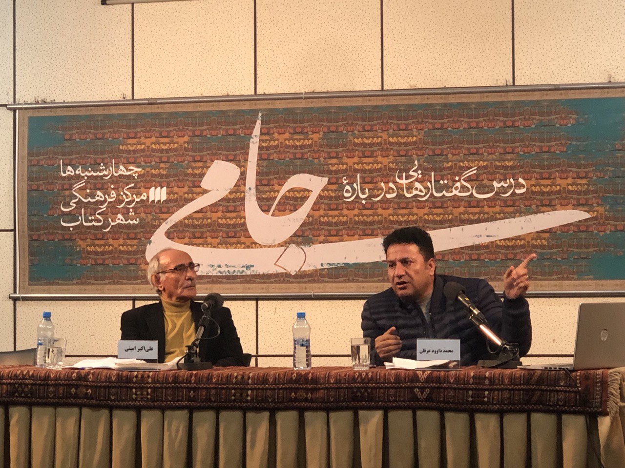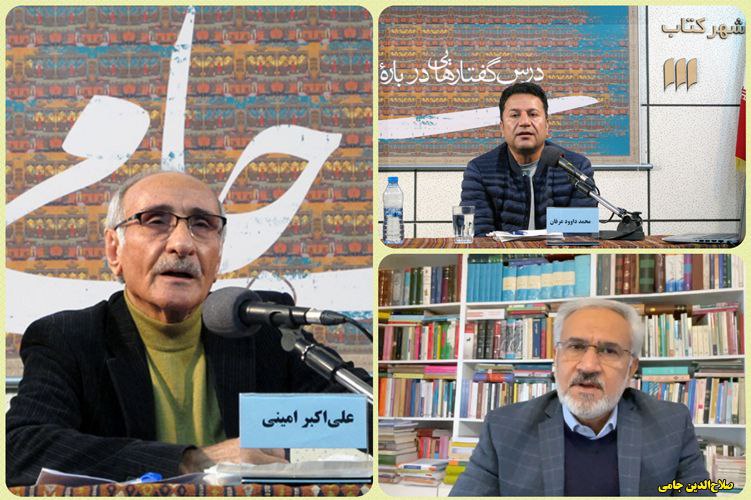 سپس دکتر علیاکبر امینی گفت: من میخواهم بر بیتالغزل شعر و نثر جامی تکیه کنم. اگر قرار باشد از بحر بیکران آثار چهل و پنج گونه جامی یک ماهی بزرگ صید کنیم، آن عشق است. عشق محور همه اندیشههای مولانا است. قبل از این که وارد بشوم میخواهم نکتهای را درباره سخنان دکتر عرفان بگویم. در بیان ایشان حدیثی از پیامبر(ص) مورد تردید واقع شد که در آن ایشان فرموده بودند که در زمان پادشاهی عادل به دنیا آمده بودند. باید بگویم که چنین نیست و این احادیث کاملا معتبرند. درباره عدالت انوشیروان صرفا به احادیث تکیه نمیکنیم و باید منابع تاریخی را مد نظر قرار بدهیم. اکنون به بحث خود میپردازم که در این دو بیت نشان داده شده است: