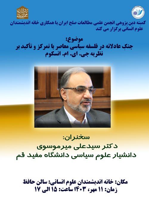 در تاریخ ۱۱ مهرماه ۱۴۰۳ از سوی کمیته دین پژوهی انجمن علمی مطالعات صلح ایران نشستی در خانه اندیشمندان برگزار شد. در این برنامه جناب آقای دکتر سید علی میرموسوی (عضو هیات علمی دانشگاه مفید) در موضوع جنگ عادلانه در فلسفه سیاسی معاصر با تمرکز و تاکید بر نظریه خانم انسکوم، (فیلسوف سرشناس انگلیسی زبان در قرن بیستم) به ایراد سخن پرداختند.