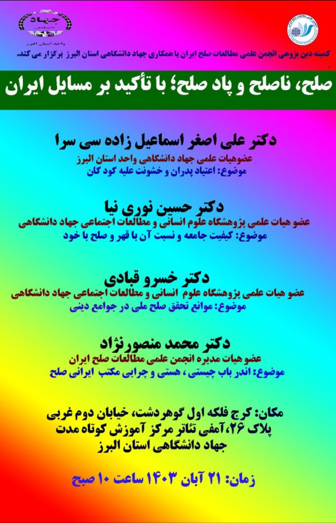 در تاریخ ۲۱ آبان ماه ۱۴۰۳ از سوی کمیته دین پژوهی انجمن علمی مطالعات صلح ایران، با همکاری جهاد دانشگاهی استان البرز در مکان جهاد کرج نشست علمی برگزار گردید.