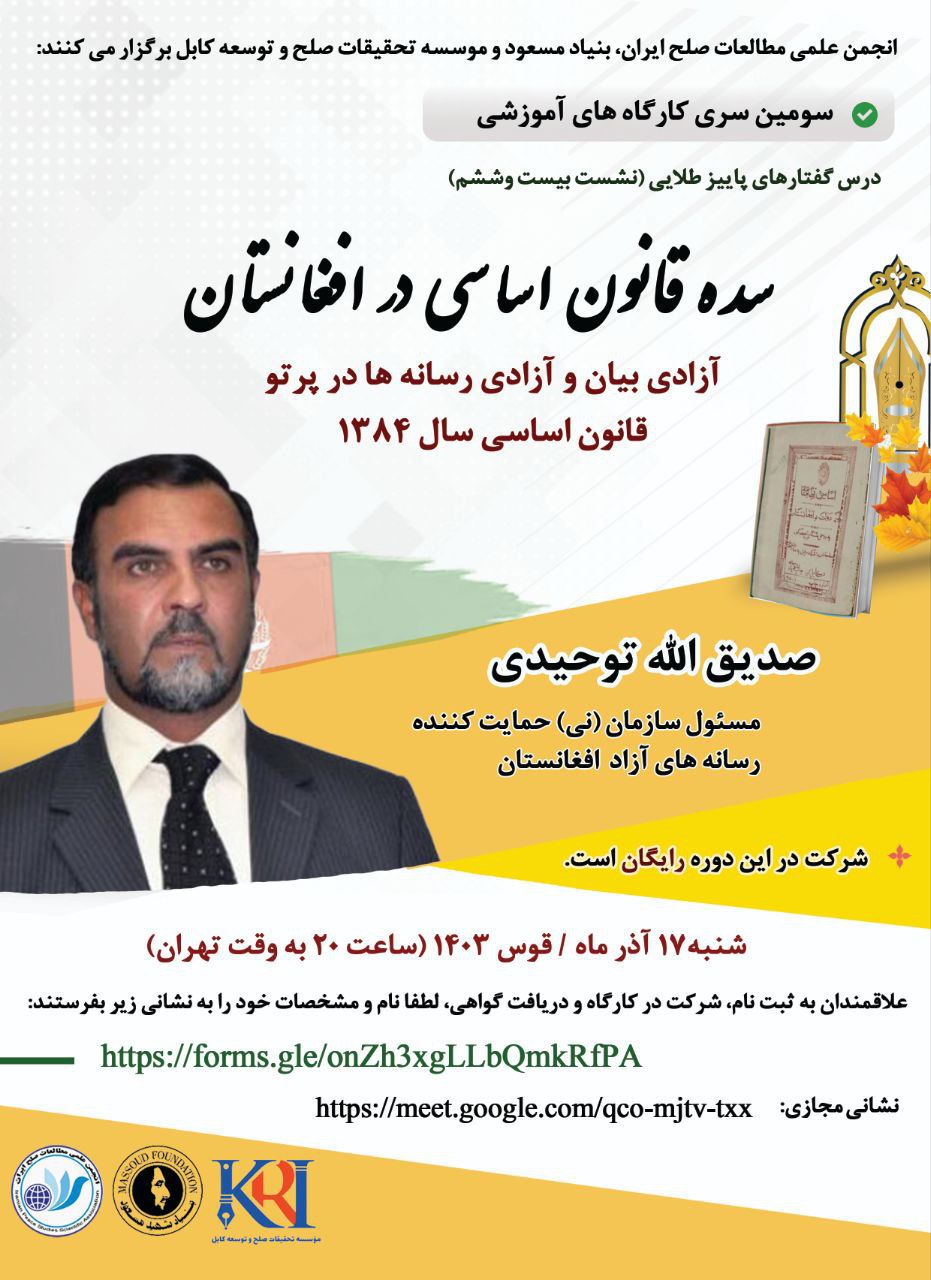 انجمن علمی مطالعات صلح ایران، بنیاد مسعود و موسسه تحقیقات صلح و توسعه کابل برگزار می کنند: