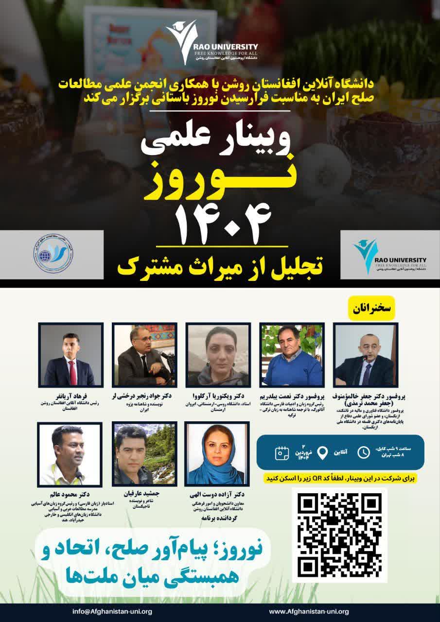 دانشگاه آنلاین افغانستان روشن، با همکاری انجمن علمی مطالعات صلح ایران، وبینار ویژه را به مناسبت نوروز برگزار میکند. این رویداد با حضور سخنرانانی از کشورهای ترکیه، تاجیکستان، ارمنستان، اوزبیکستان، هندوستان، افغانستان و ایران برگزار خواهد شد، و به بررسی نقش نوروز در تقویت پیوندهای فرهنگی و ترویج صلح جهانی خواهد پرداخت.