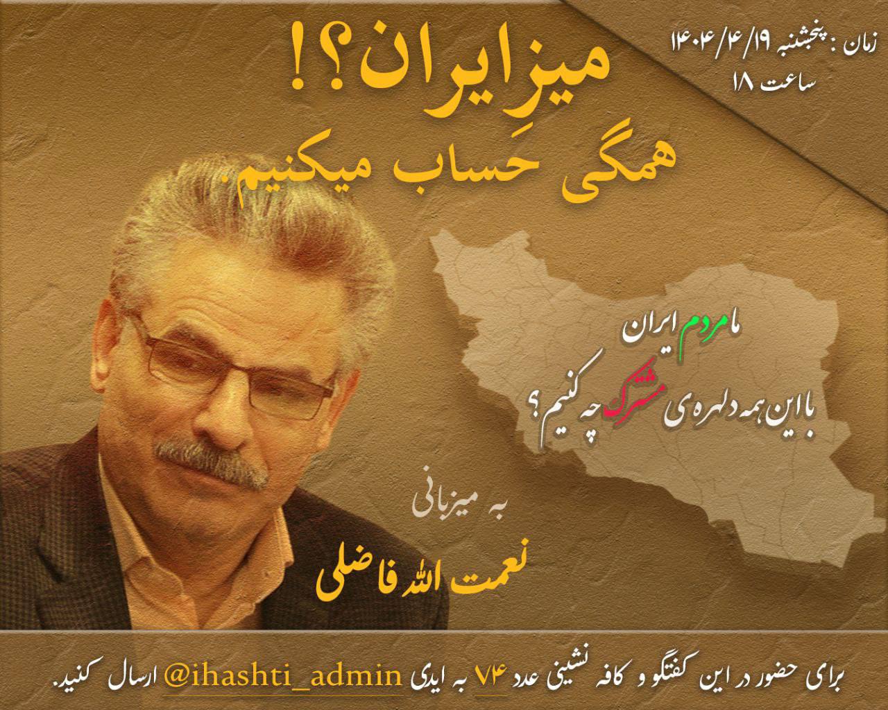 برترشاخصویژه گفتگو با دکتر نعمتالله فاضلی تیر 19, 1404تیر 19, 1404 انجمن علمی مطالعات صلح اخبار انجمن را همرسانی کنید.بازدیدها: 85گفتگو با دکتر نعمتالله فاضلی موضوع: میز ایران پنجشنبه ۱۹ تیرماه ۱۴۰۴ ساعت ۱۸ تهران: خیابان سمیه، تقاطع ایرانشهر، کافه پترن جهت رزرو به آی دی زیر پیام دهید: @ihashti_admin https://t.me/ipsan