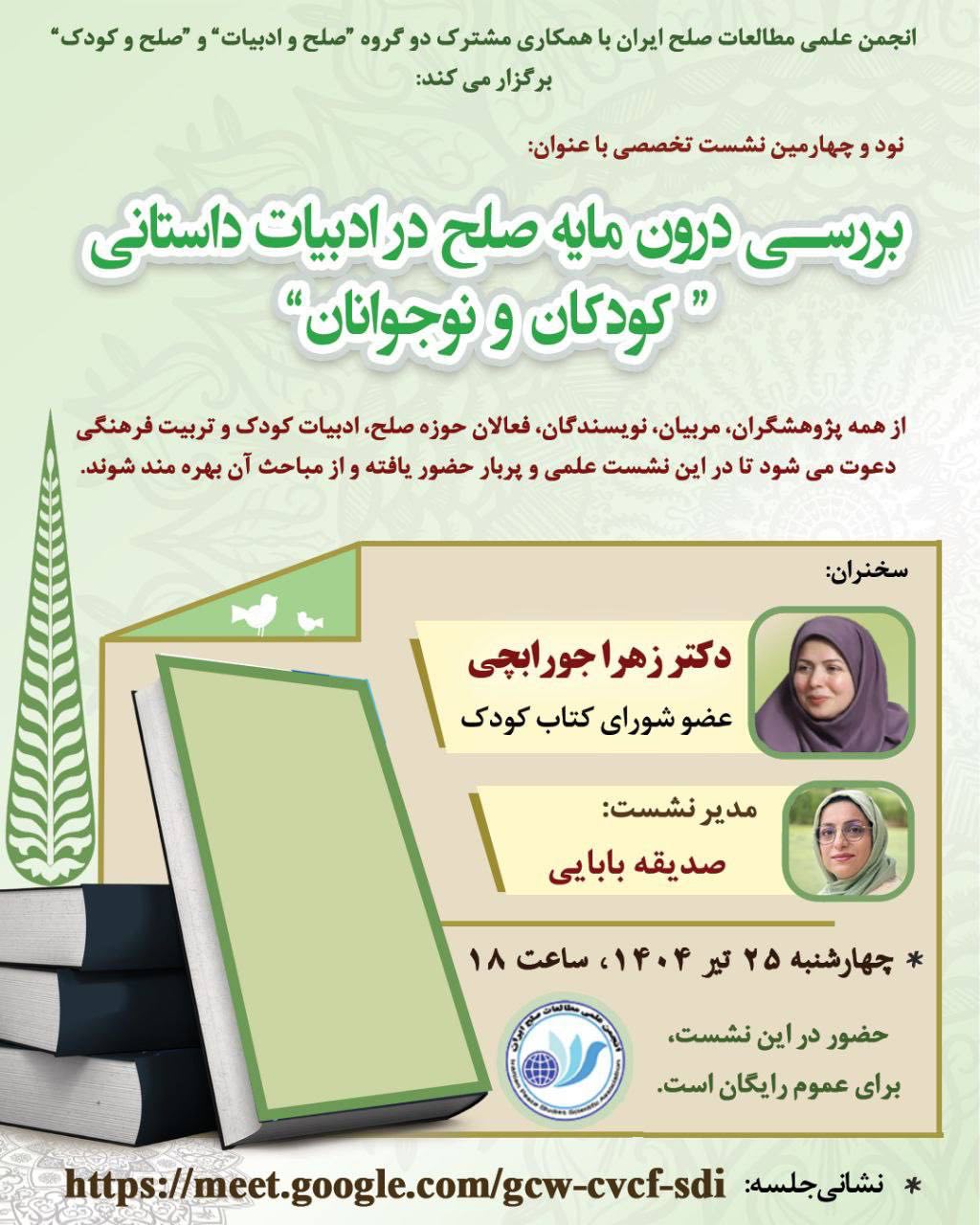 انجمن علمی مطالعات صلح ایران با همکاری مشترک دو گروه «صلح و ادبیات» و «صلح و کودک» برگزار می‌کند: