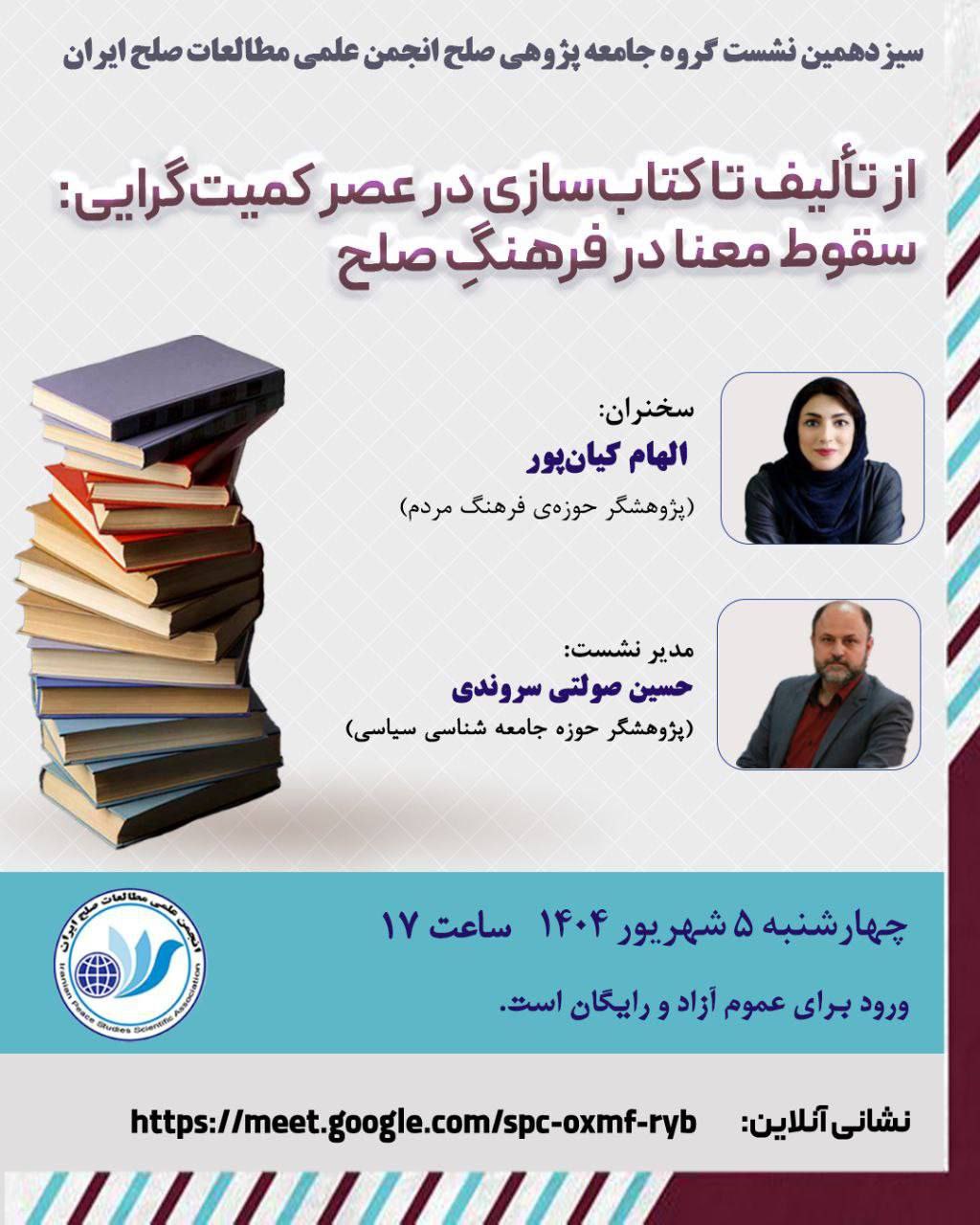گزارش مختصر ،سیزدهمین نشست گروه جامعه‌پژوهی صلح انجمن علمی مطالعات صلح ایران، روز چهارشنبه ۵ شهریور ۱۴۰۴ با موضوع «از تألیف تا کتاب‌سازی در عصر کمیت‌گرایی» به صورت آنلاین برگزار شد.