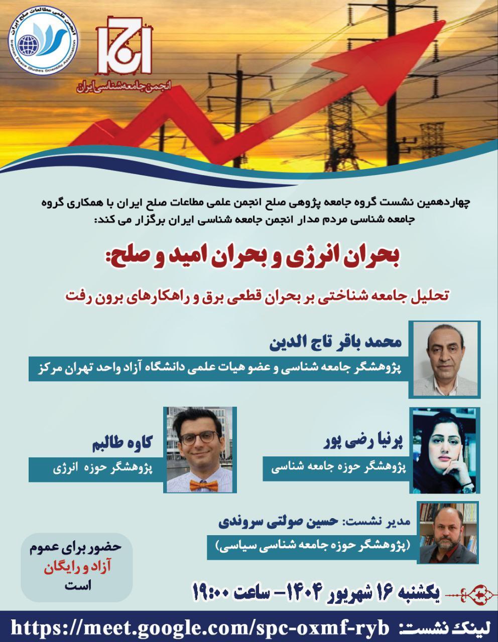 چهاردهمین نشست «گروه جامعهپژوهی صلح» انجمن علمی مطالعات صلح ایران، با همکاری گروه جامعهشناسی مردممدار و انجمن جامعهشناسی ایران، یکشنبه ۱۶ شهریور ۱۴۰۴ به بررسی بحران انرژی و تأثیرات آن بر امید و صلح اجتماعی اختصاص یافت. این نشست با حضور پژوهشگران حوزه جامعهشناسی و انرژی، شامل محمدباقر تاجالدین، پرنیا رضیپور و کاوه طالبم، و با مدیریت حسین صولتی سروندی برگزار شد. ورود برای عموم آزاد و رایگان بود و نشست به صورت آنلاین از طریق گوگل میت قابل دسترسی بود.
