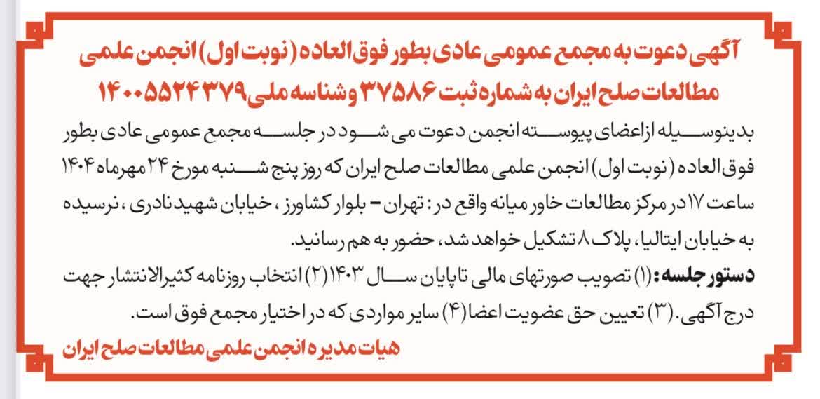 بدینوسیله ازاعضای پیوسته انجمن دعوت می شود در جلسه مجمع عمومی عادی بطور فوق العاده (نوبت اول) انجمن علمی مطالعات صلح ایران که روز پنج شنبه مورخ ۲۴ مهرماه ۱۴۰۴ ساعت ۱۷ در مرکز مطالعات خاور میانه واقع در بلوار کشاورز ، خیابان شهید نادری ، نرسیده به خیابان ایتالیا ، پلاک ۸ تشکیل خواهد شد، حضور بهم رسانید.