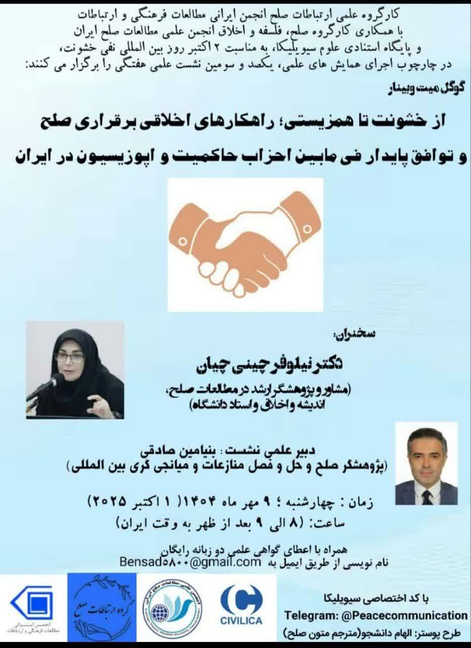 گروه صلح، فلسفه و اخلاق انجمن علمی مطالعات صلح ایران و کارگروه علمی ارتباطات صلح انجمن ایرانی مطالعات فرهنگی و ارتباطات برگزار می کنند: