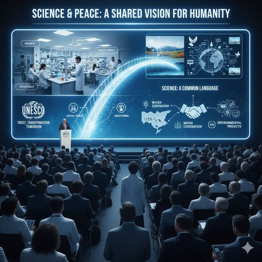 علم و صلح دو آرمان مشترکاند که در طول تاریخ، گاه در مسیر سازندگی و گاه در مسیر تخریب به کار گرفته شدهاند. وی با اشاره به ابتکار یونسکو در نامگذاری روز« علم درخدمت صلح و توسعه» یادآور شدند که «صلح را باید در ذهن انسانها بنا کرد»؛ شعاری که هنوز هم یکی از ضروریترین نیازهای بشریت است.