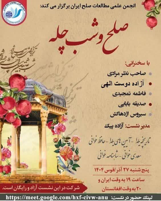 برترویژه صلح و شب چله آذر 27, 1404آذر 27, 1404 انجمن علمی مطالعات صلح اخبار انجمن را همرسانی کنید.بازدیدها: 10 صلح و شب چله با حضور: صاحب نظر مرادی آزاده دوست الهی فاطمه تمجیدی صدیقه بابایی سیروس اژدهاکش مدیر نشست: آزاده پیک پنج شنبه ٢٧ آذر ساعت ١٩ در گوگل میت: https://meet.google.com/hxf-civw-anu شرکت در این نشست آزاد و رایگان است. https://t.me/ipsan