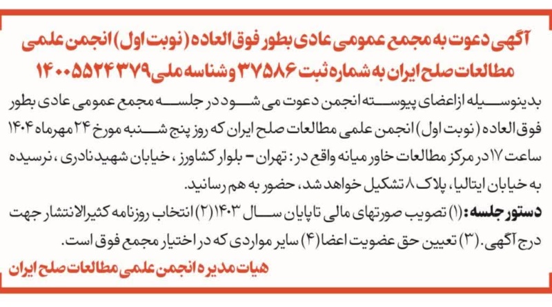 Read Moreبازدیدها: ۸۱انجمن علمی مطالعات صلح ایران به شماره ثبت ۳۷۵۸۶ و شناسه ملی۱۴۰۰۵۵۲۴۳۷۹ آگهی دعوت به مجمع عمومی عادی بطور