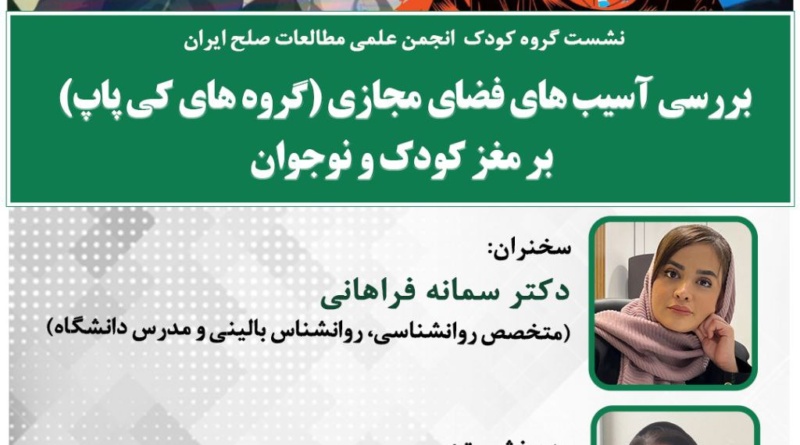 Read Moreبازدیدها: ۱۱گروه صلح و کودک انجمن علمی مطالعات صلح ایران برگزار میکند: بررسی آسیبهای فضای مجازی (گروه های کیپاپ)
